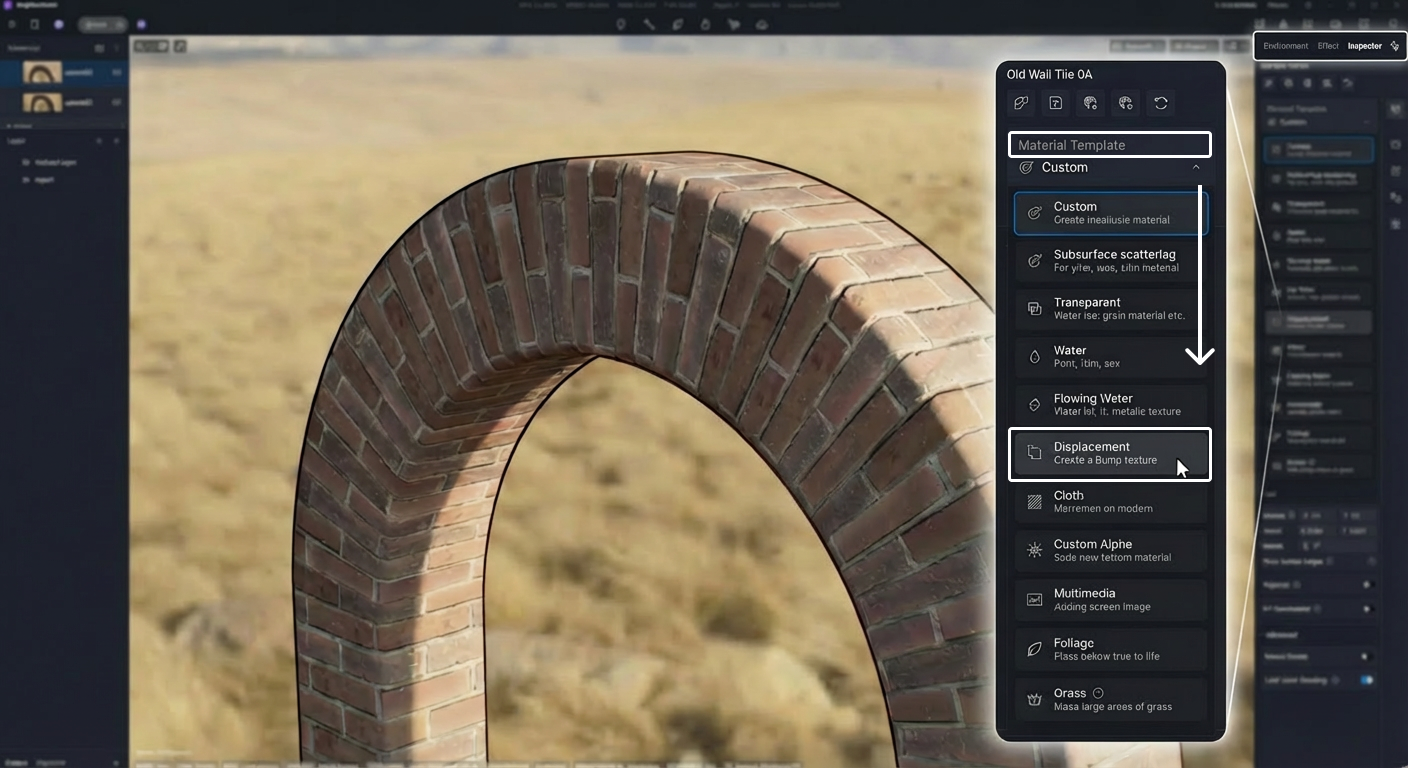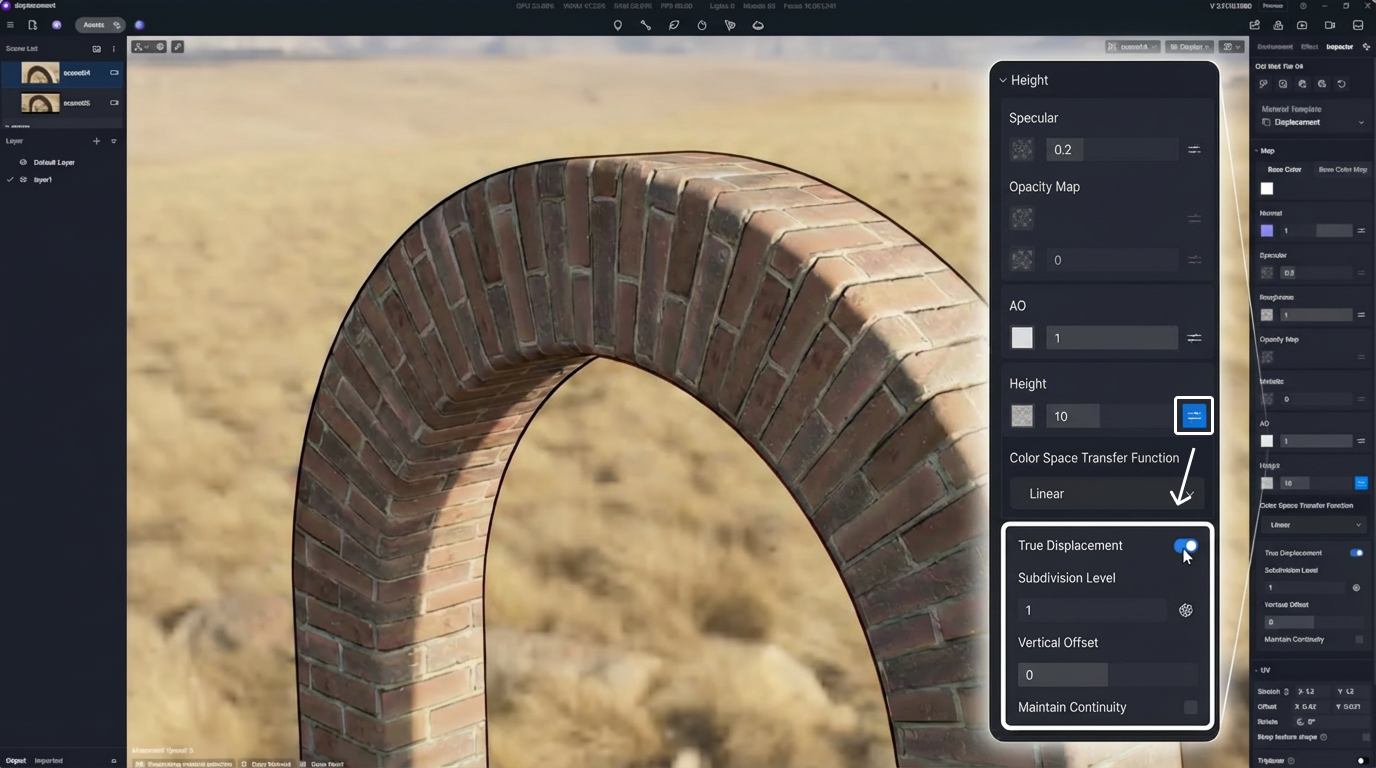 Met D5 Render kan je displacement maps toepassen via de Materiaalbibliotheek en sjablonen. D5 Render ondersteunt onder andere True Displacement, Height maps en gebruikt shaders om detail en reliëf te genereren.